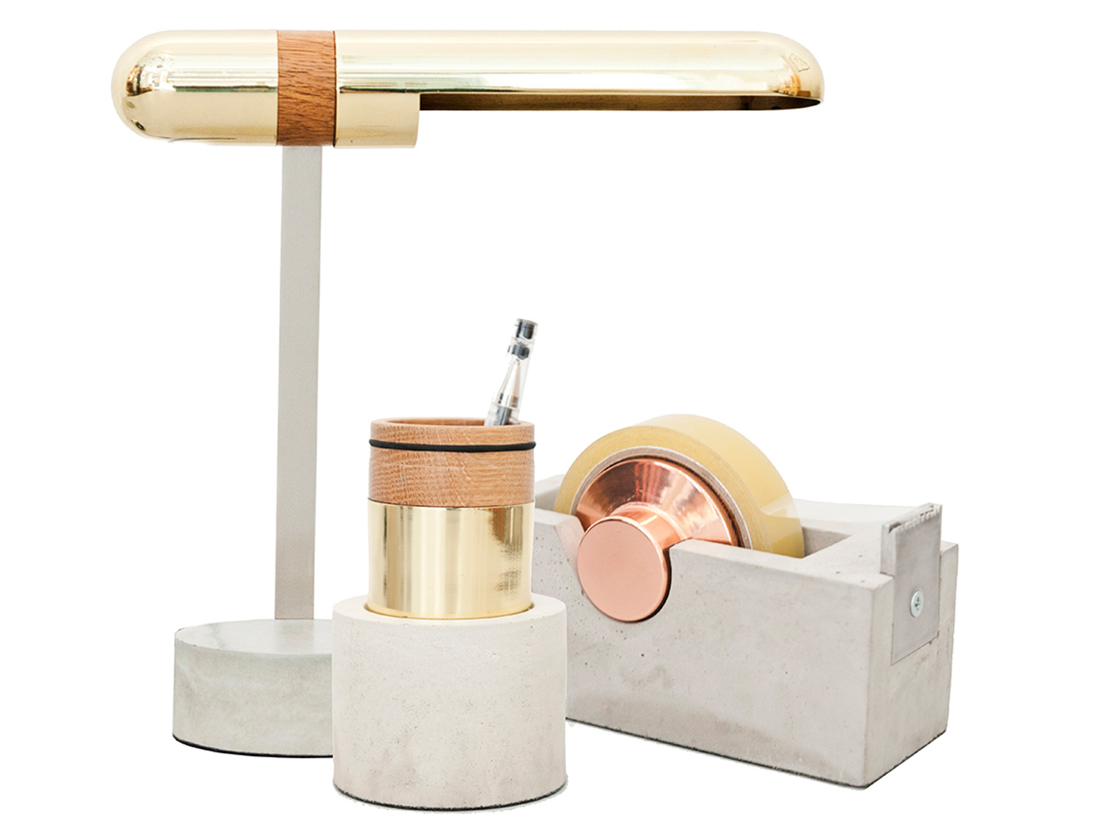 Een buitenbeetje is deze Concrete Desk Set die de Japanse designer Tatsuya Akita ontwikkelde voor het Britse Plant & Moss. In tegenstelling tot wat de naam doet vermoeden, gaat het bij deze selecte familie immers niet enkel om beton, maar vervat de groep verschillende materialen, zoals uiteraard beton, maar ook koper en hout. Het resultaat is rijkelijk en smaakvol, zonder er echt over te gaan. Het hout bijvoorbeeld is aanwezig, maar eerder bescheiden. Sowieso vallen de materialen al op zonder echt oververtegenwoordigd te zijn, wat toe te schrijven valt aan het slimme contrasteren tussen materialen…