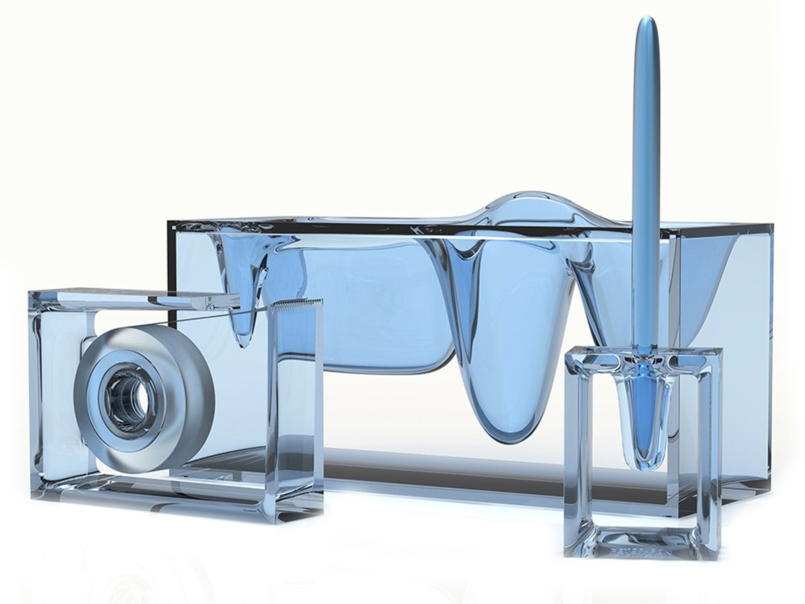 Dreamtools van het Franse Lexon is opgebouwd uit vier items, te beginnen met ‘the Liquid Station’, een vreemdsoortige houder voor tal van kantoorartikelen, denk maar aan paperclips. Dit bijna buitenaardse product lijkt ons iets te hebben van een gestolde lavalamp, geluidstechnici zien er eerder een kunststof weergave van een sinusoïdale geluidsgolf in, sommige anderen een momentopname van een mini-tsunami. Sowieso spreekt de houder het meest tot de verbeelding, met z’n vreemdsoortige voorkomen.