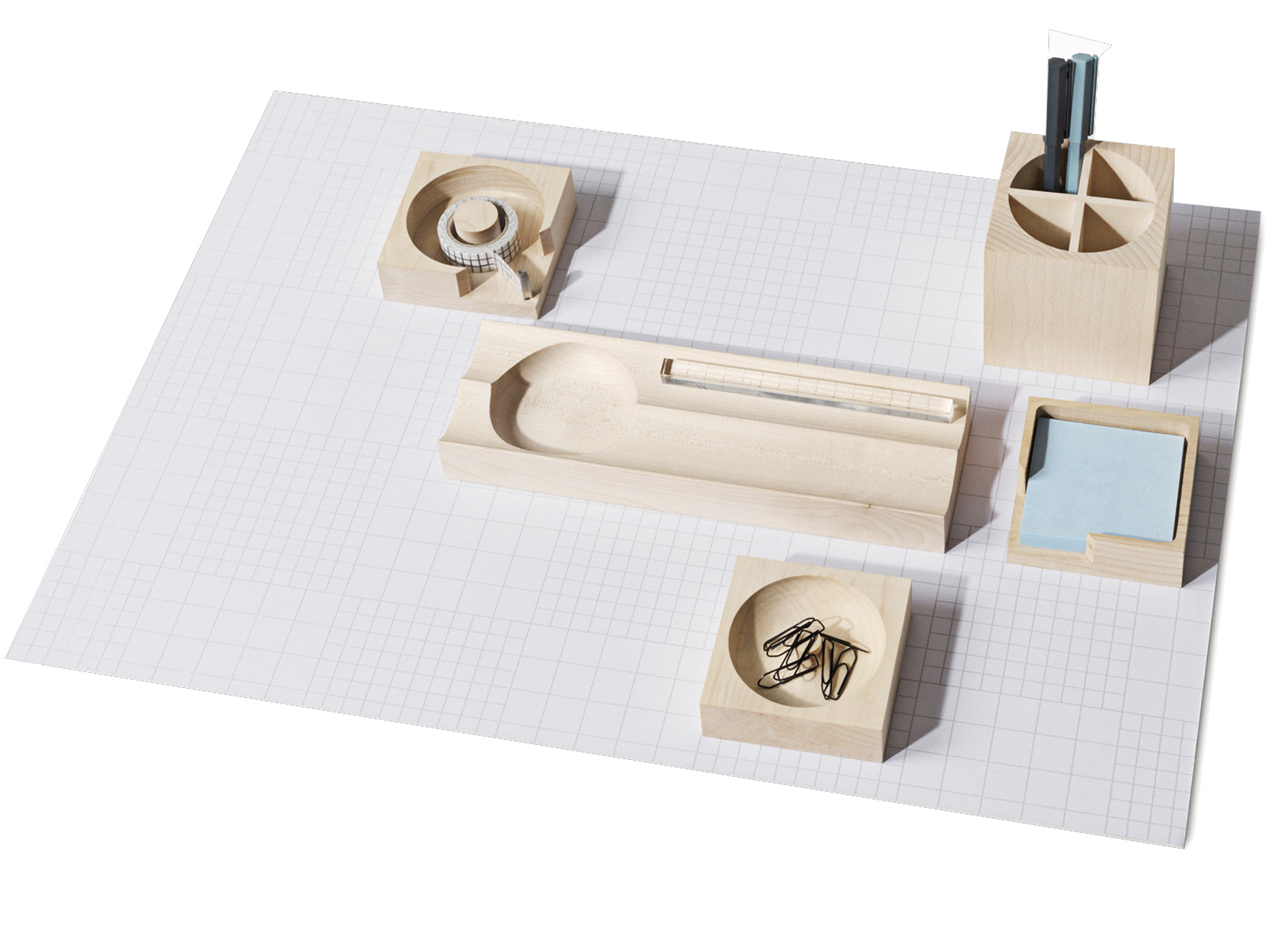 Wooden, de esdoornhouten deskset van het Scandinavische Nomess Copenhagen, is homogeen opgebouwd uit een pennenlegger, pennenbakje, een bakje voor paperclips, een tape dispenser en een houder voor post-its, waarvan de afmetingen en het design telkens op elkaar is afgestemd. De 4 vierkante items nemen telkens 9 op 9 cm in, de hogere pennenhouder is daarenboven ook 9 cm hoog. De lagere items zijn slechts 3 cm hoog. De pennenlegger meet tenslotte 26,8 cm op 9, en is net als de andere lage stuks 3 cm hoog.