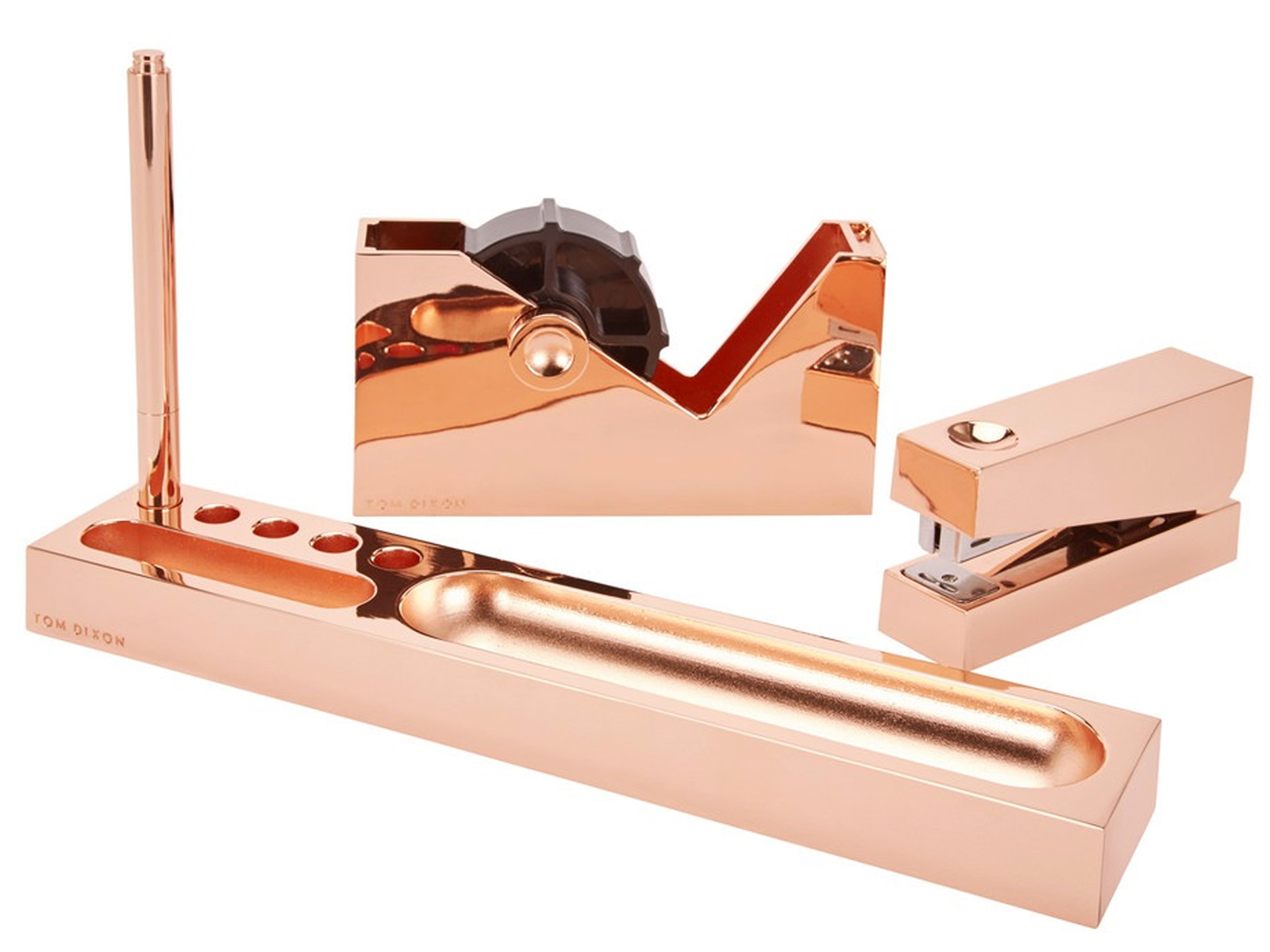 Met de collectie die begin 2015 werd gelanceerd, zet Tom Dixon zijn hommage aan het Britse erfgoed gemoedelijk verder. De nieuwe producten omvatten items van allerhande pluimage, maar een van de meest opvallende is deze koperen CUBE. CUBE is een reeks van minimalistische bureauartikelen, ontdaan van al wat overbodig is en gestript tot louter het fundamentele: een zinklegering met een koperen laagje. Het resultaat is een opvallend glamoureuze verschijning met daarin een nietmachine, pennen, een pennenhouder en een tapedispenser.