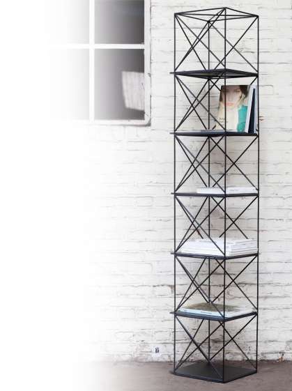 Serax boekenrekHet eerste product is een opvallend boekenrek, in de hoogte opgebouwd met ijzerdraad als diagonale steunen. Het boekenrek is er in 180, 207 of 235,5 cm hoog, met respectievelijk plaatsinnames van 29 op 29, 34 op 34 of 39 op 39 cm.