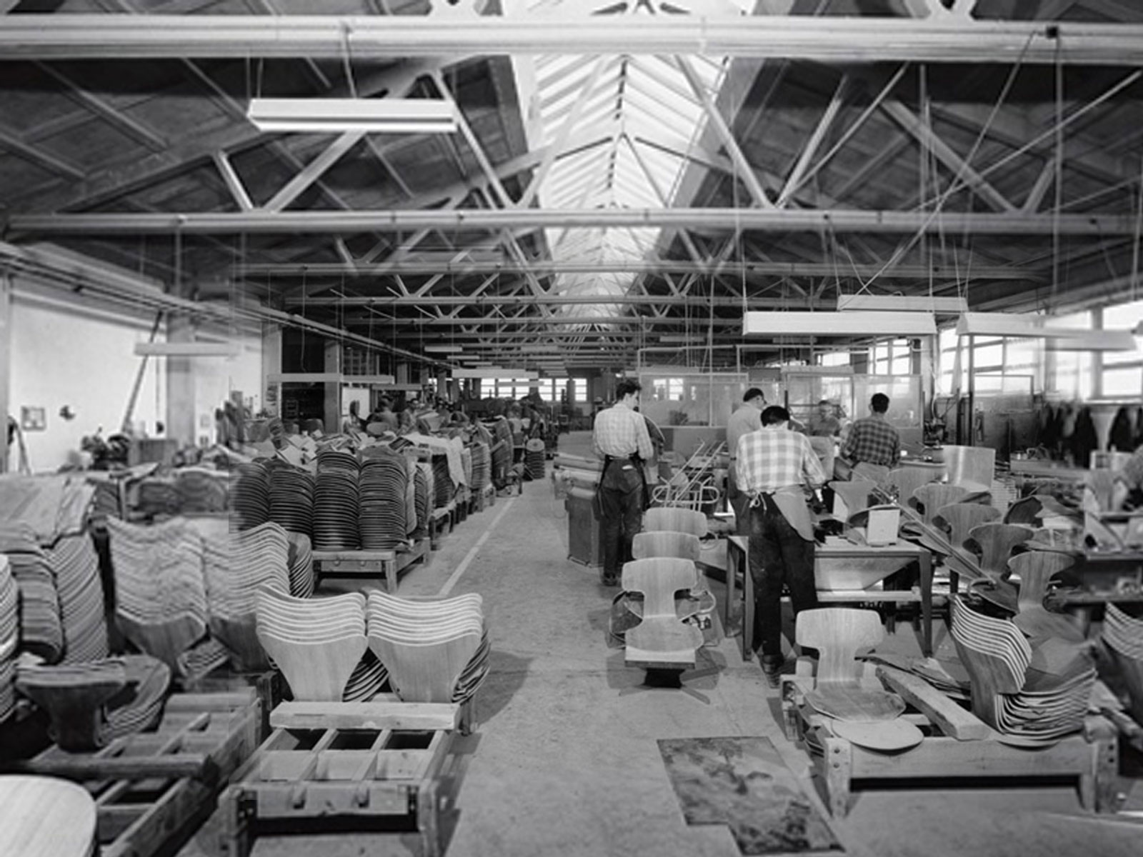 De Mier bleek als snel een regelrecht schot in de roos: het werd de eerste Deense stoel die in serie werd geproduceerd, zij het dan wel met een metalen onderstel in plaats van de aanvankelijk plastic poten. Op de foto hieronder zie je de productie van de Mier en de Vlinder in de Fritz Hansen fabriek in 1957. Drie jaar later volgde de Vlinder, die in tegenstelling tot z’n voorganger over een rank pootje extra beschikte. Zowel de zeven-serie (de Vlinder) als de Mier kwamen perfect tegemoet aan moderne eisen. Zo waren ze allebei erg licht, compact en bovendien ook stabelbaar.