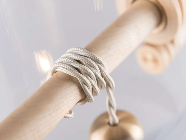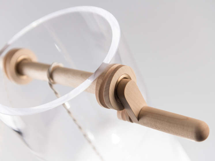 Met de waterputten van weleer als inspiratiebron, kan je de Well-lamp immers dimmen door ze dieper in een gradueel minder transparante vaas te laten zakken, en dit met behulp van het draaien aan een houten lier. Ook de voedingskabel voor de lamp werd mooi weggewerkt in textiel, wat de gedachte aan de waterput enkel versterkt. De koperen lampfitting maakt het plaatje af.