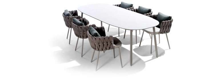 Deze lijn valt naast z’n organische vormen ook vooral op door het gebruik van een bijzonder innovatief en natuurlijk uitziend materiaal: een soort naadloze en gebreide ‘kous’ van polyolefin en textileen, met binnenin EPDM-mousse. Want wie zegt dat buitenmeubilair altijd strak hoort te zijn? In opdracht van TRIBÙ wist ontwerpster Monica Armani aan te tonen dat ook luxueuze outdoormeubels zacht en comfortabel kunnen zijn, net als hun indoor tegenhangers.