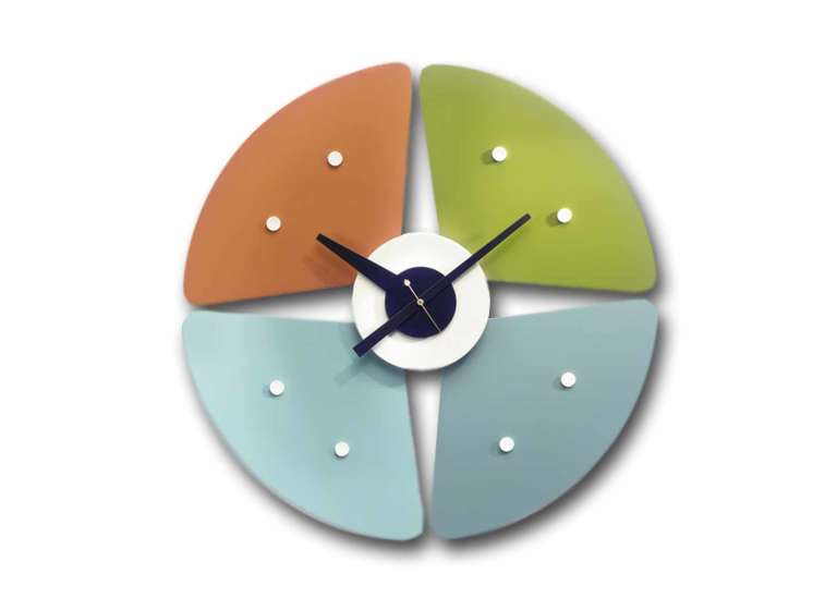 De Petal Clock is misschien nog de ‘meest gewone’ binnen dit opvallende drietal. De klok is, op de uitsparingen na, nagenoeg rond. De Petal Clock is er, naast deze kleurige variant, ook met zwarte ‘bloemblaadjes’ en de centrale schijf in messing. De diameter van de klok bedraagt zo’n 44,8 cm.